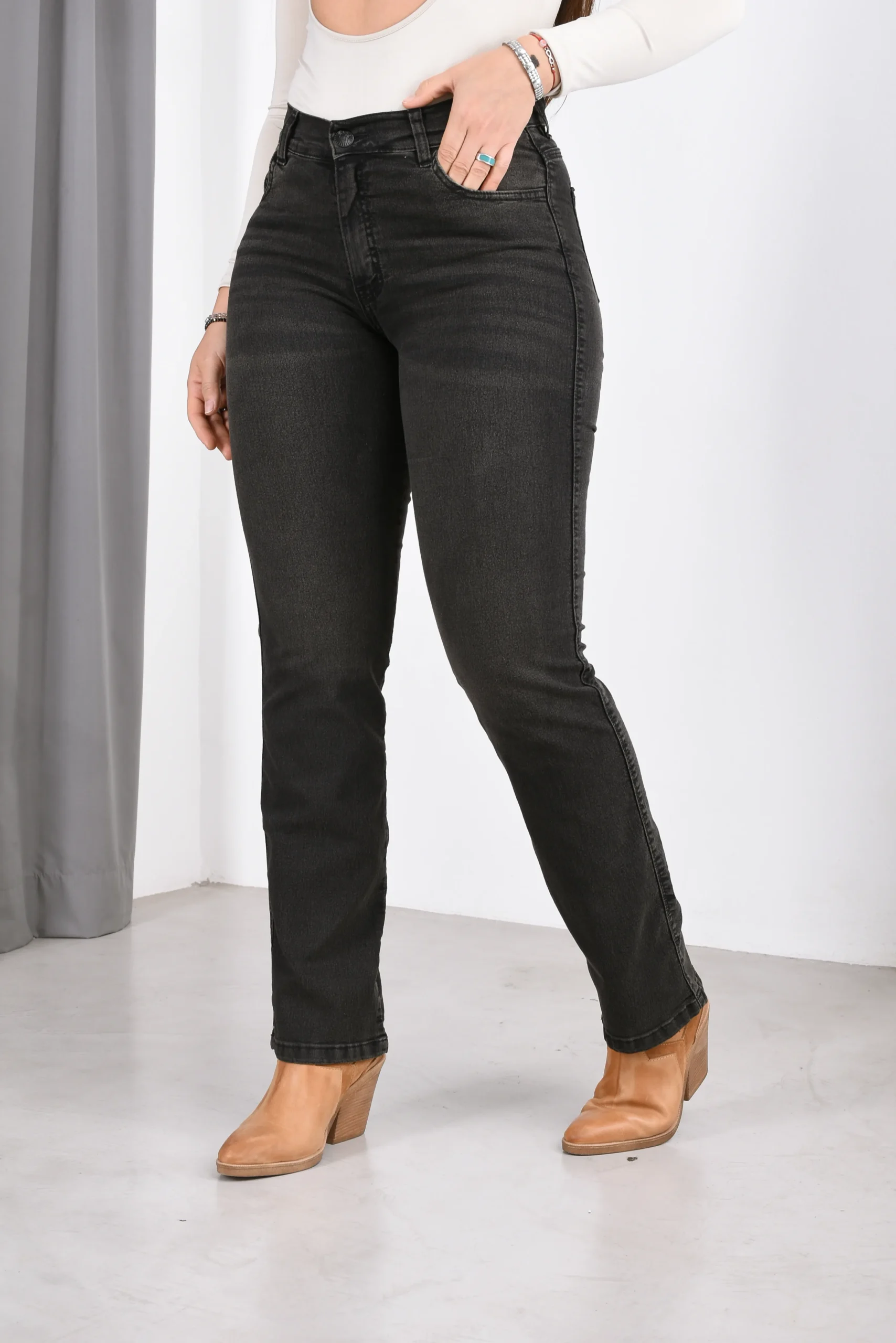 Jean recto matizado marrón clásico con localizado suave, tiro alto elastizado.