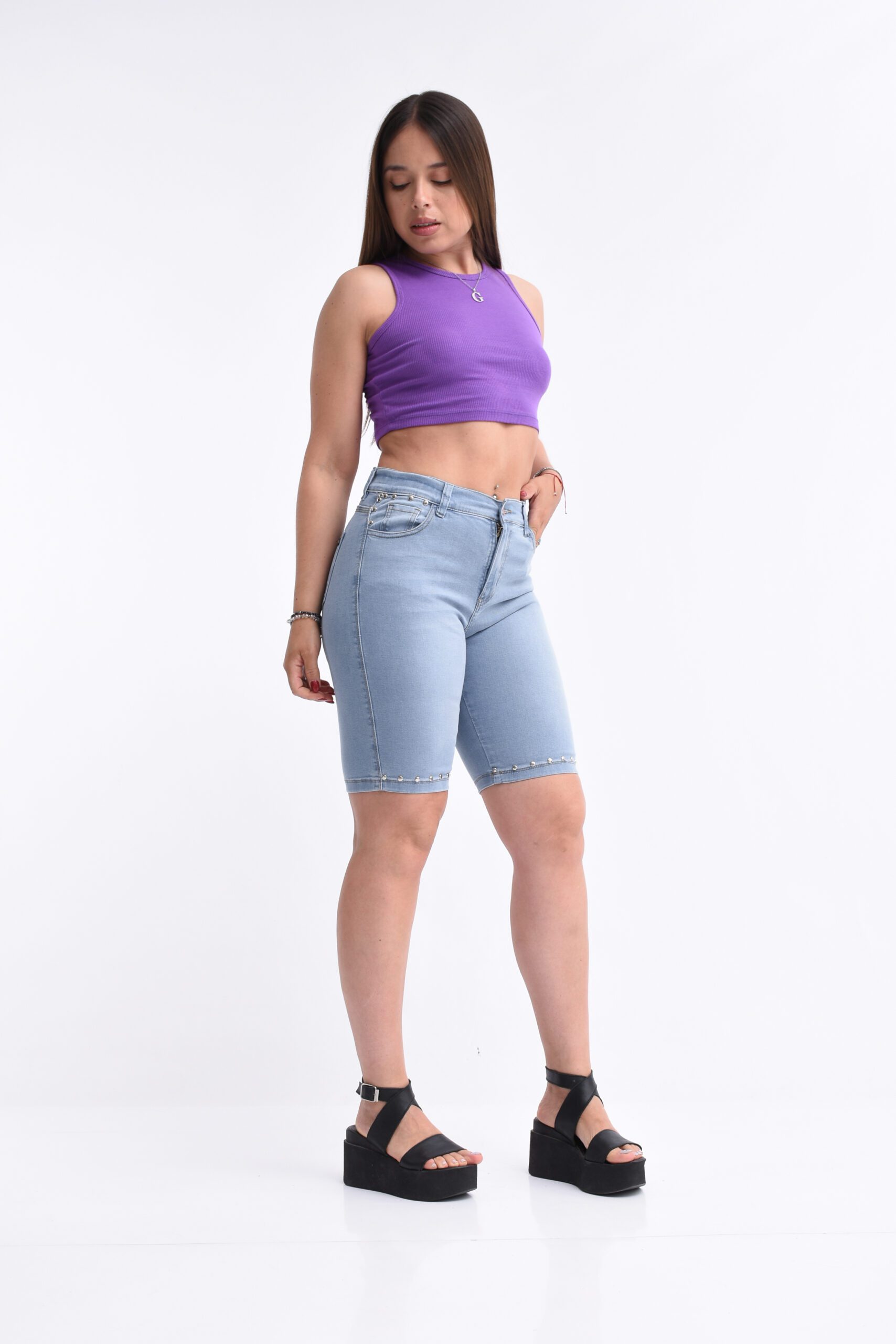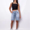 Bermuda elastizado celeste tiro alto, con un diseño de tachas alrededor del bolsillo y la bota.