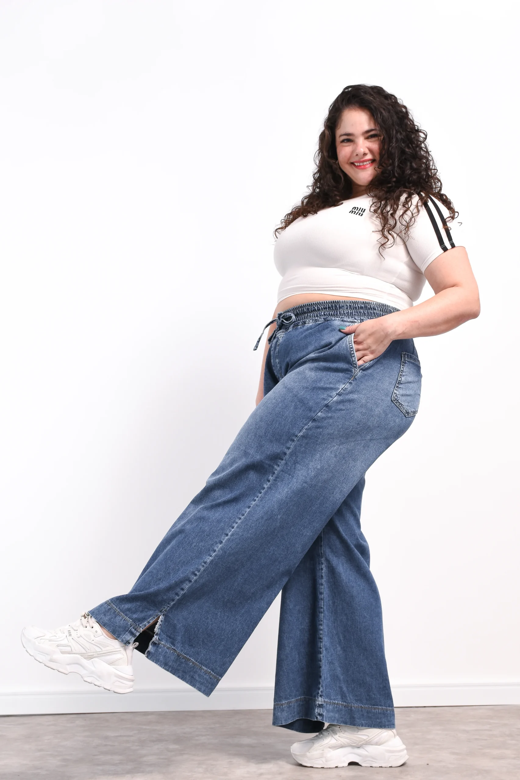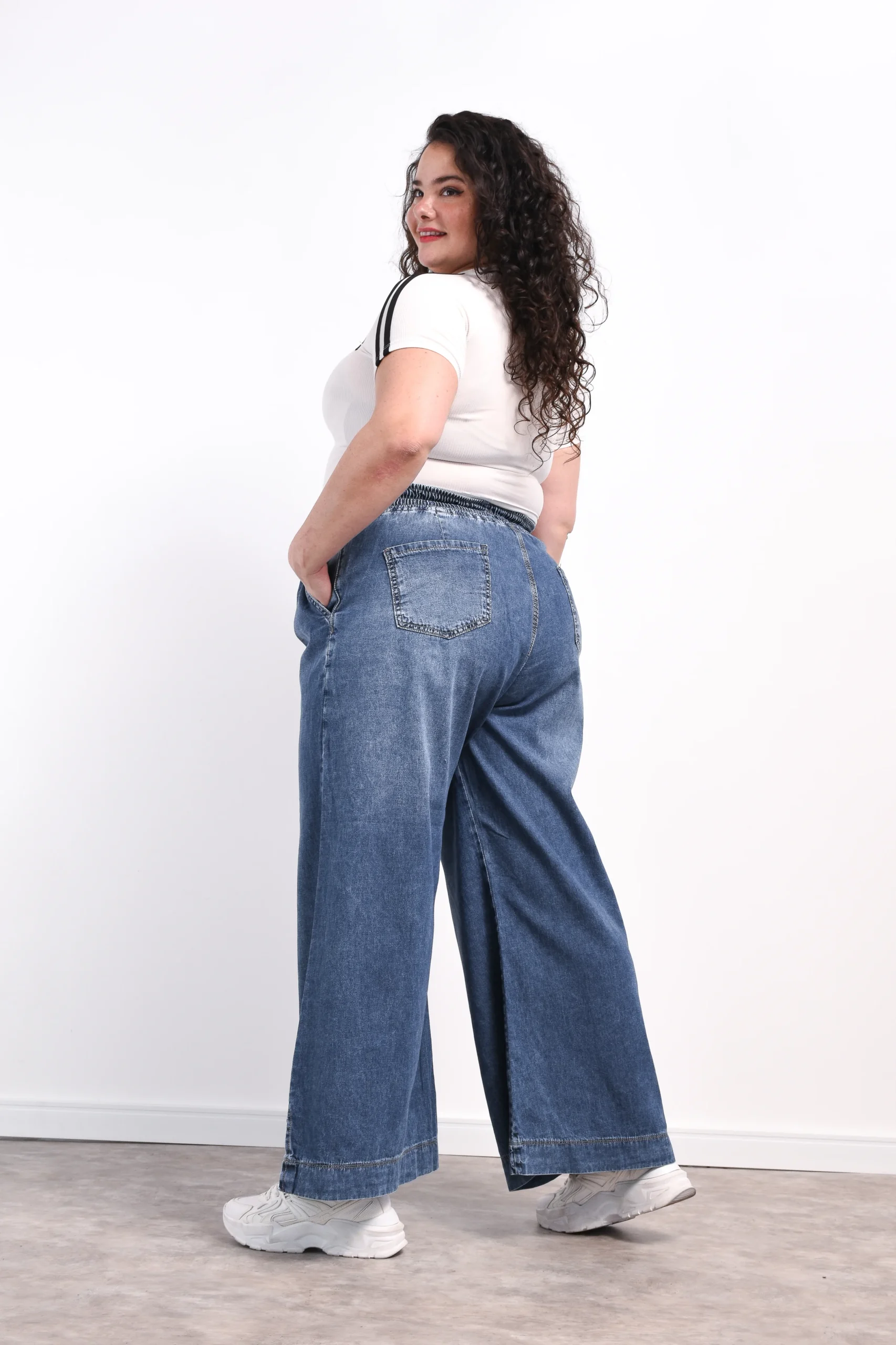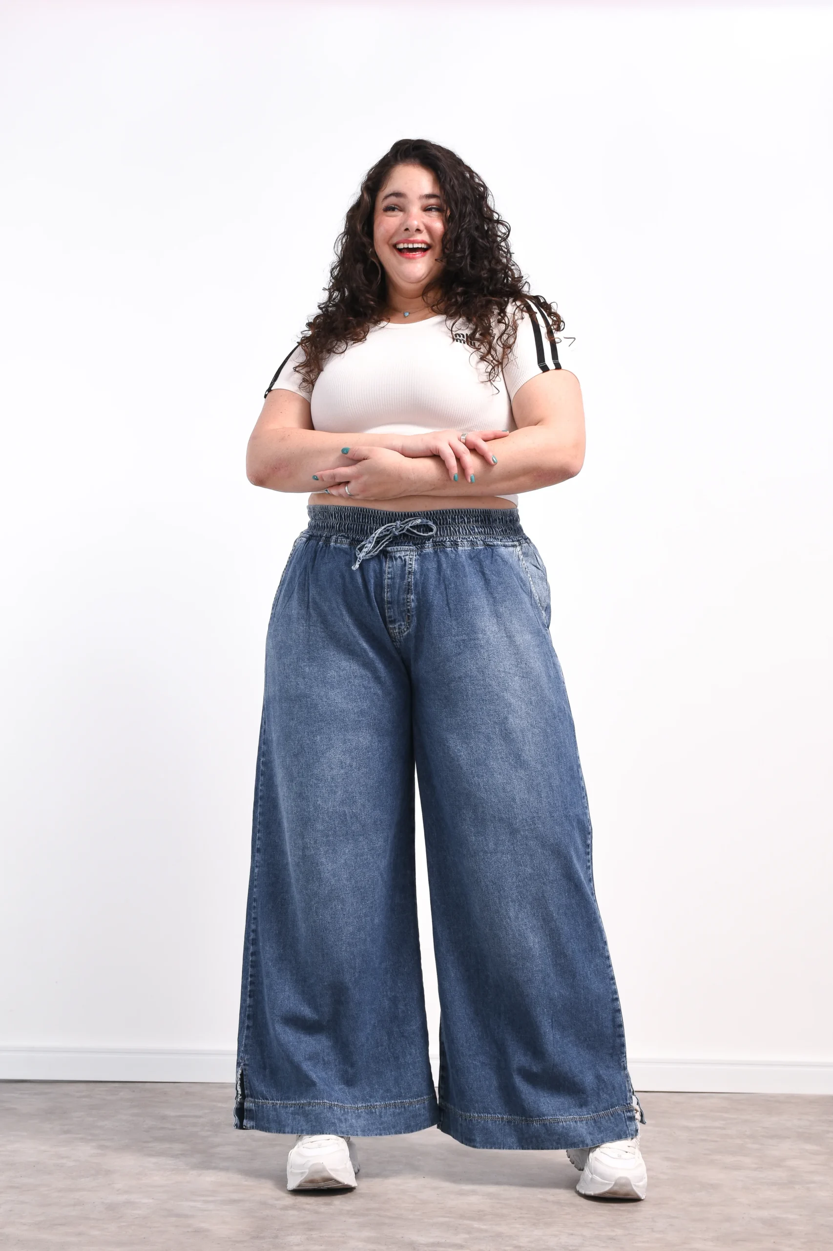 Jean wide leg confeccionado en una tela camisera seleccionada por su ligereza y frescura, ideal para quienes buscan el estilo del denim sin su peso tradicional. Su diseño destaca por una cintura totalmente elástica y libre de botones, lo que garantiza un ajuste perfecto. Su tiro alto y piernas amplias que estilizan la figura