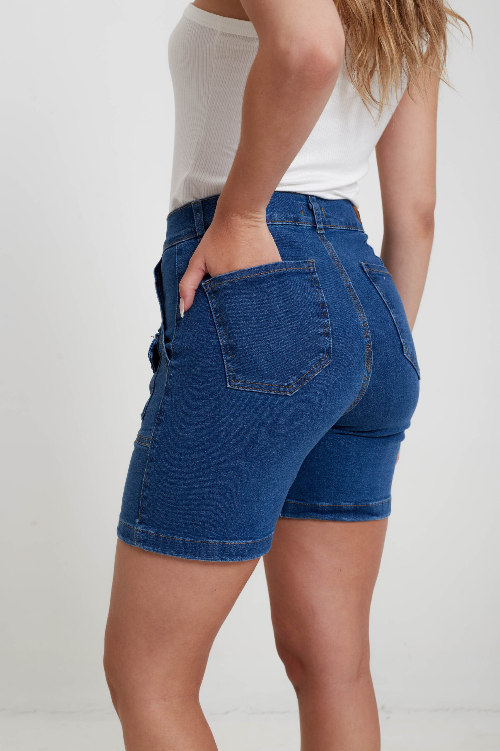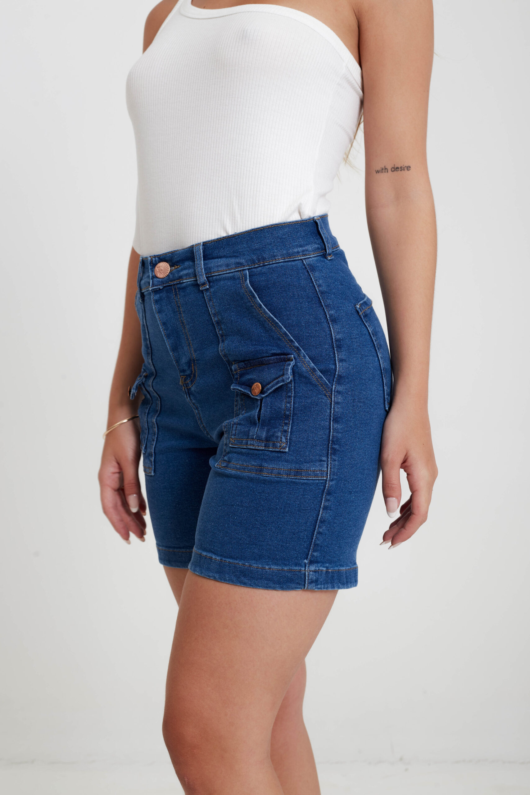 Short cargo azul, elastizado, tiro alto con bolsillos funcionales.