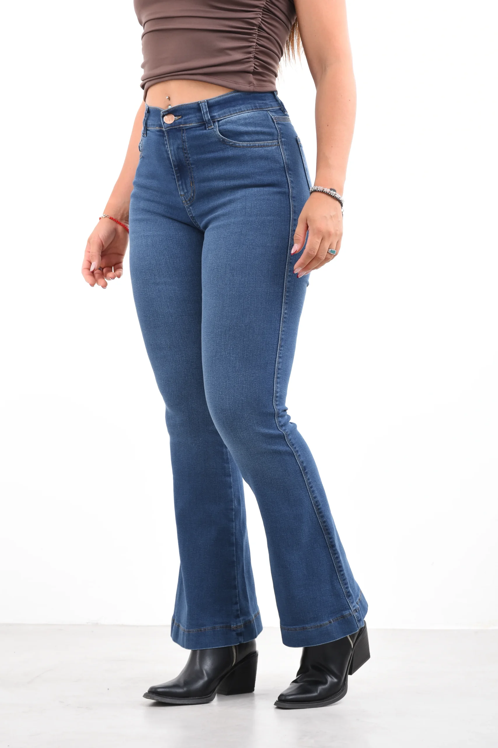 Oxford denim blue elastizado, tiro alto con bolsillos funcionales.