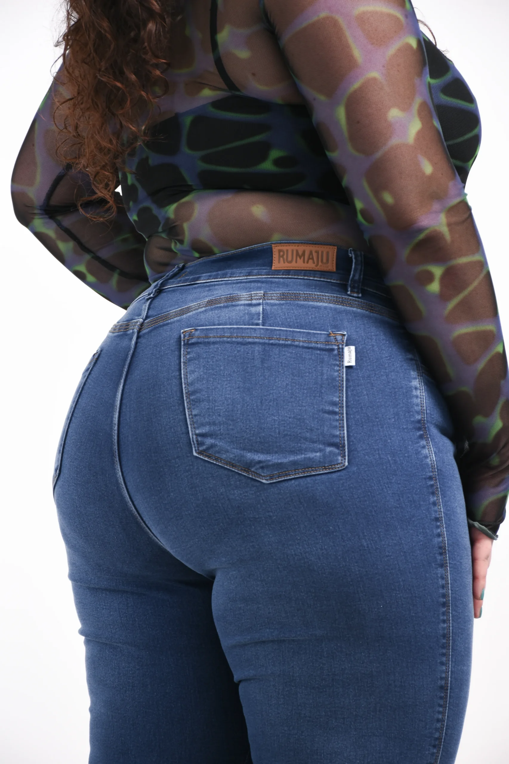 Oxford denim blue elastizado, tiro alto con bolsillos funcionales.