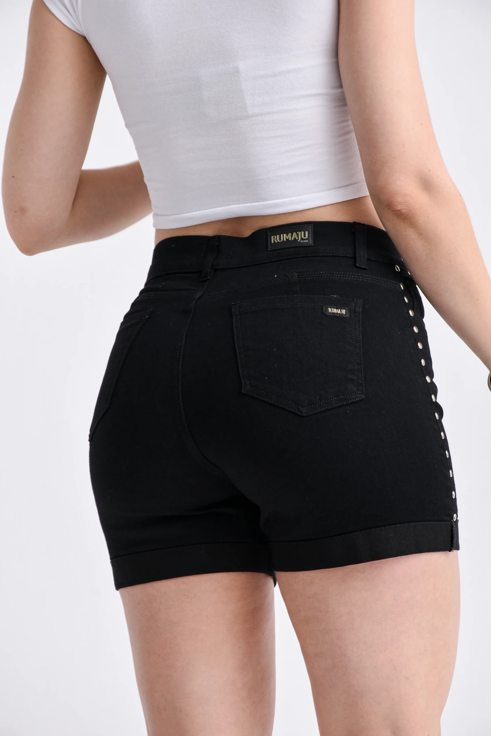 Short negro elastizado tiro alto, con tachas laterales y bolsillos funcionales.