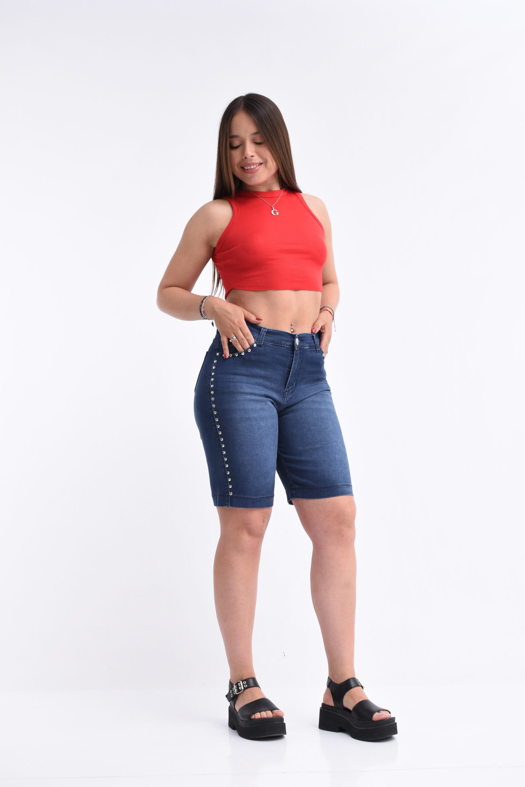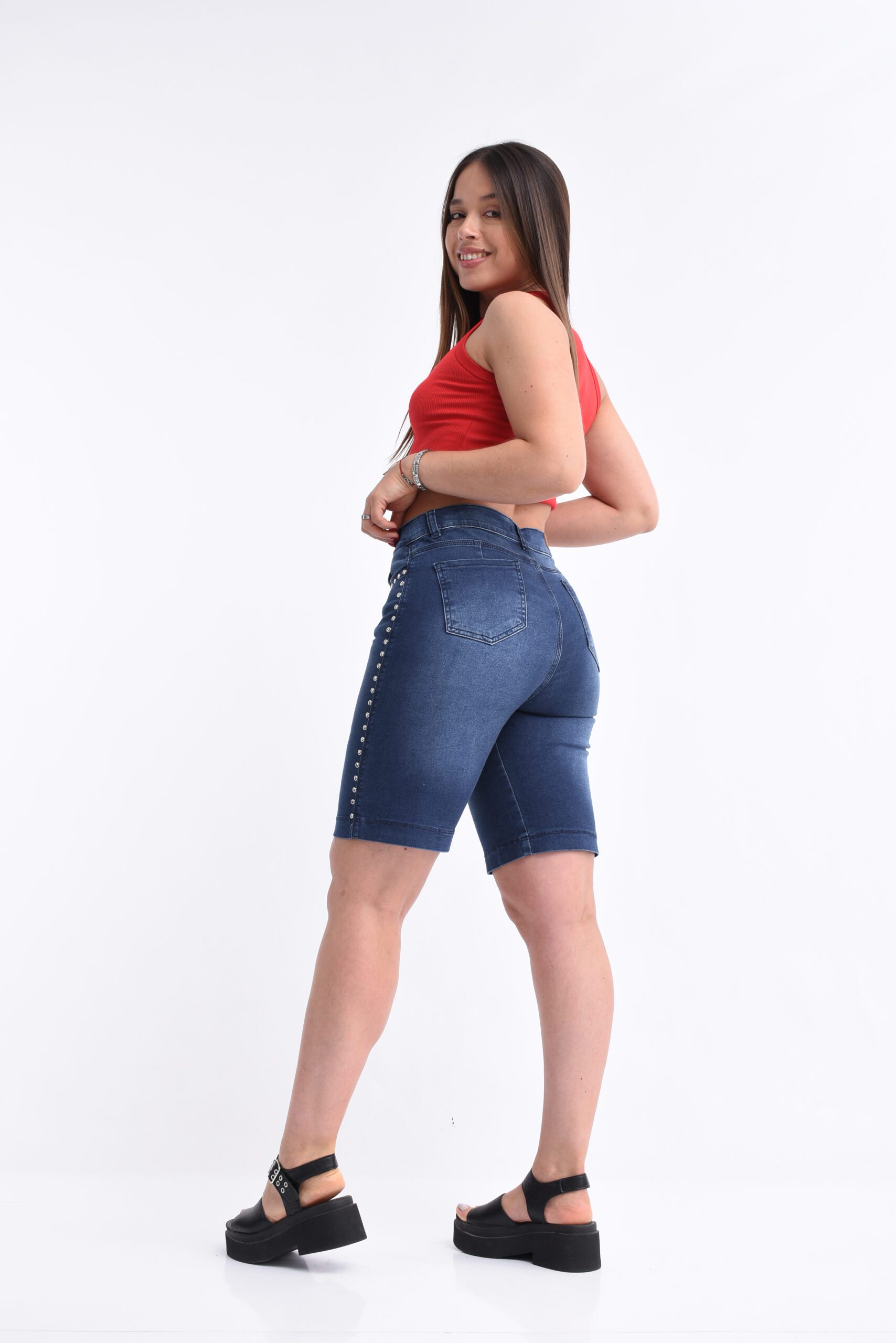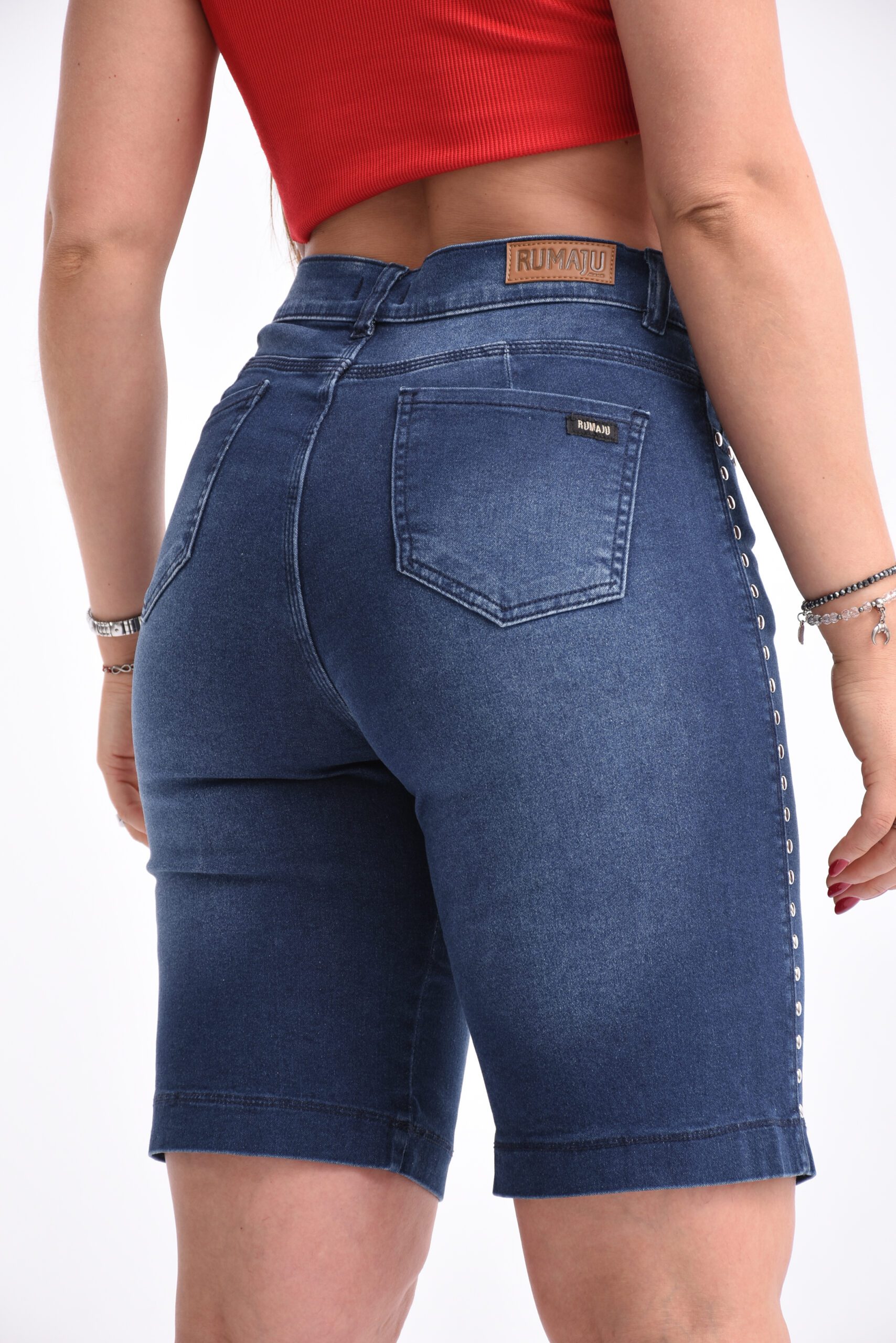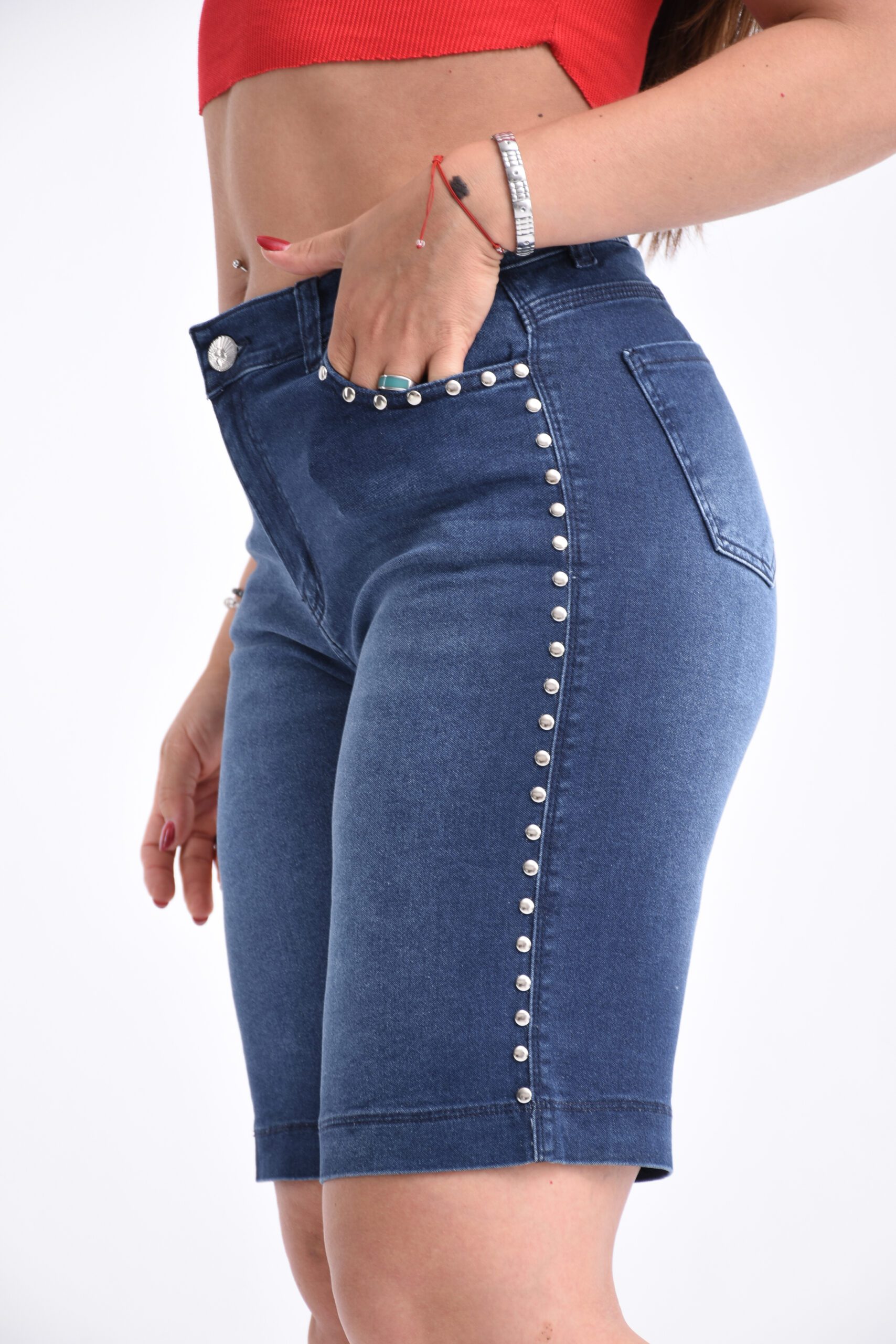 Bermuda elastizado azul tiro alto, con bolsillos funcionales y una hilera de tachas.