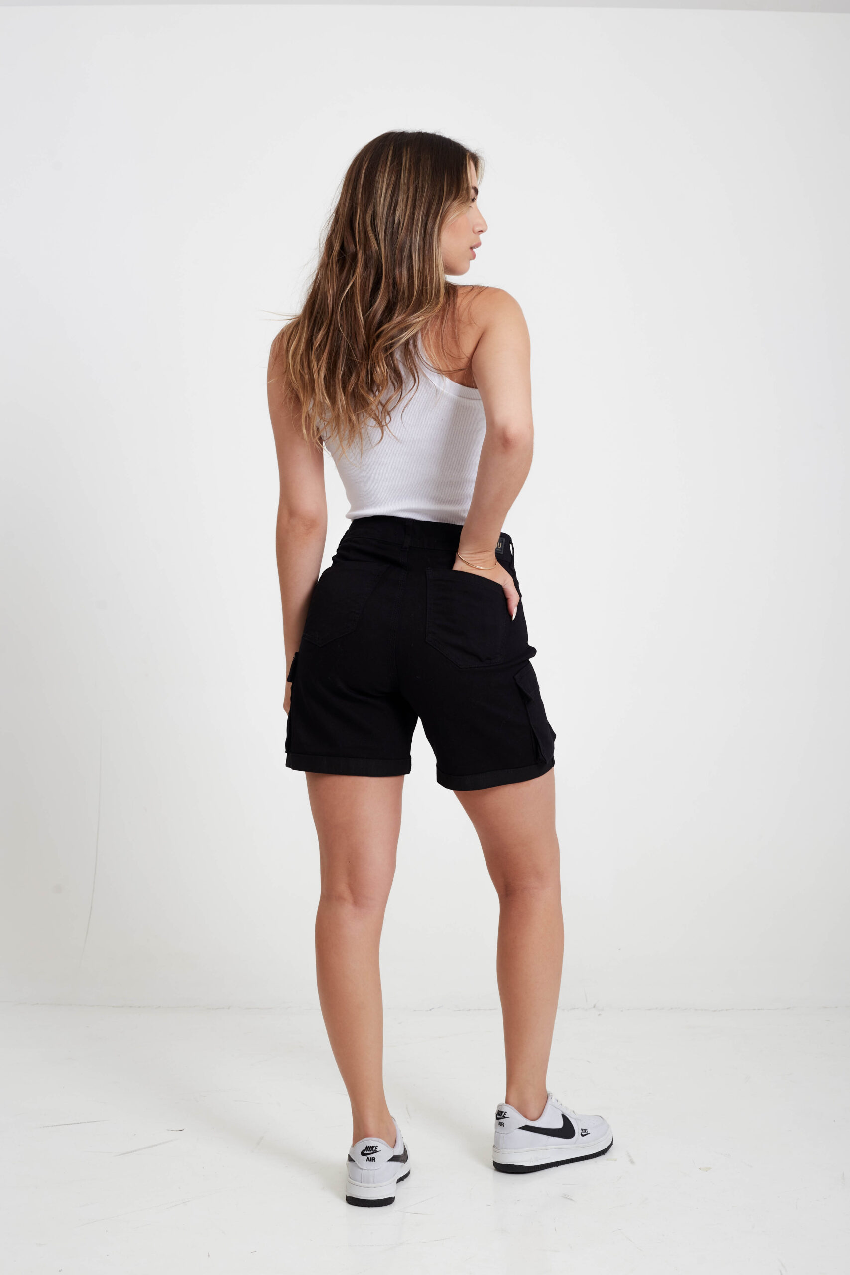 Short cargo negro, elastizado tiro alto con bolsillos funcionales.