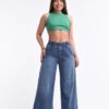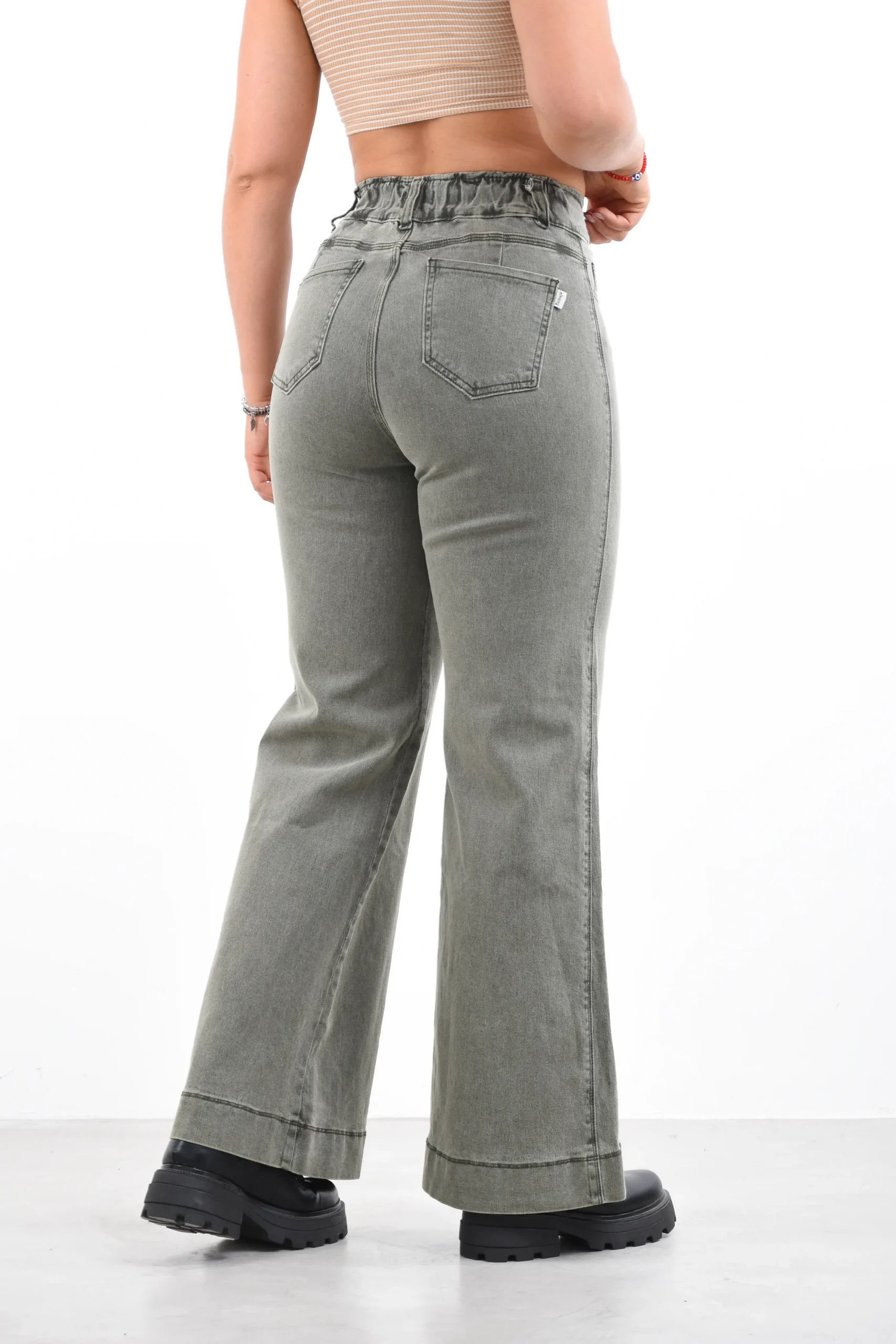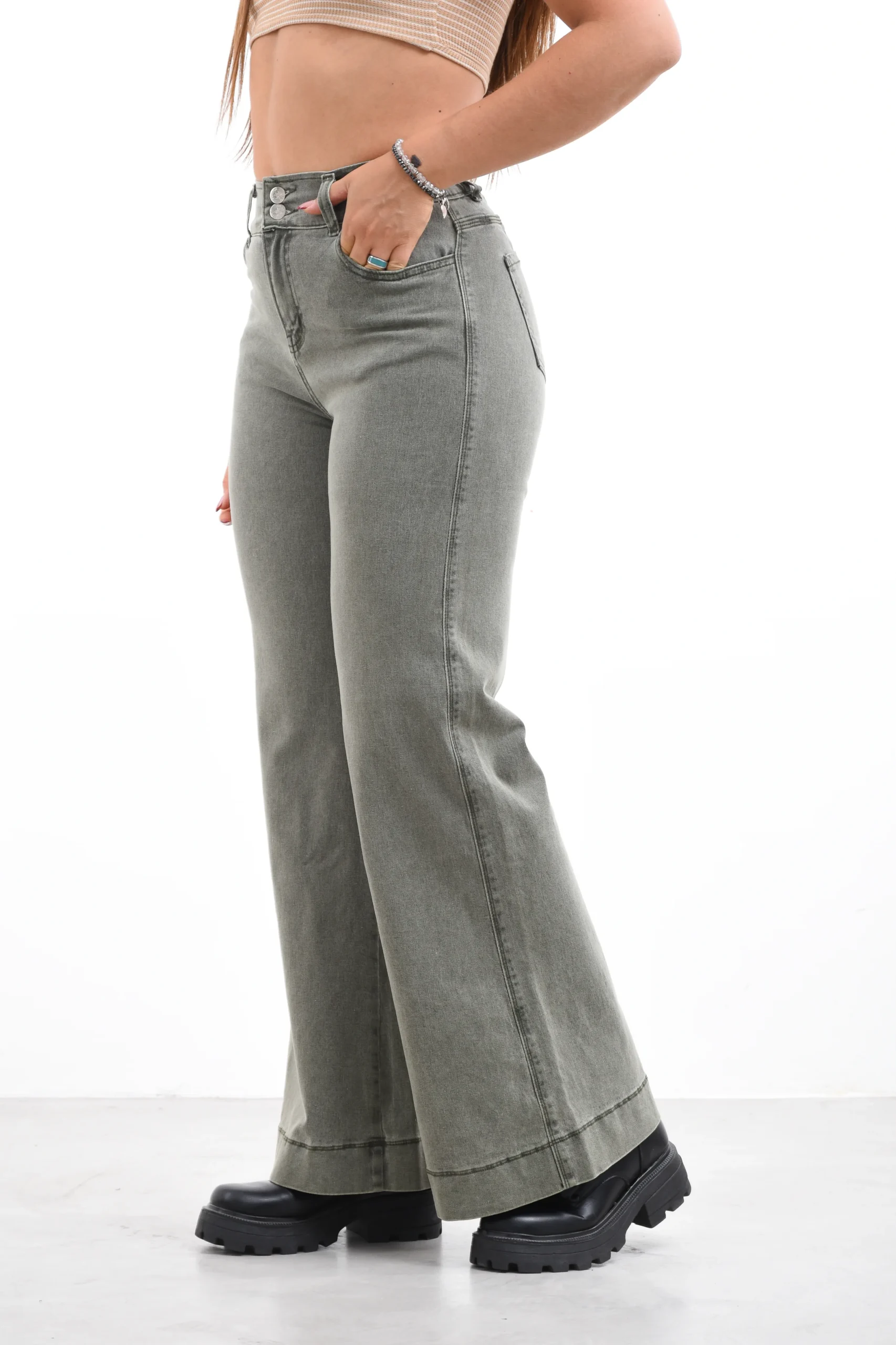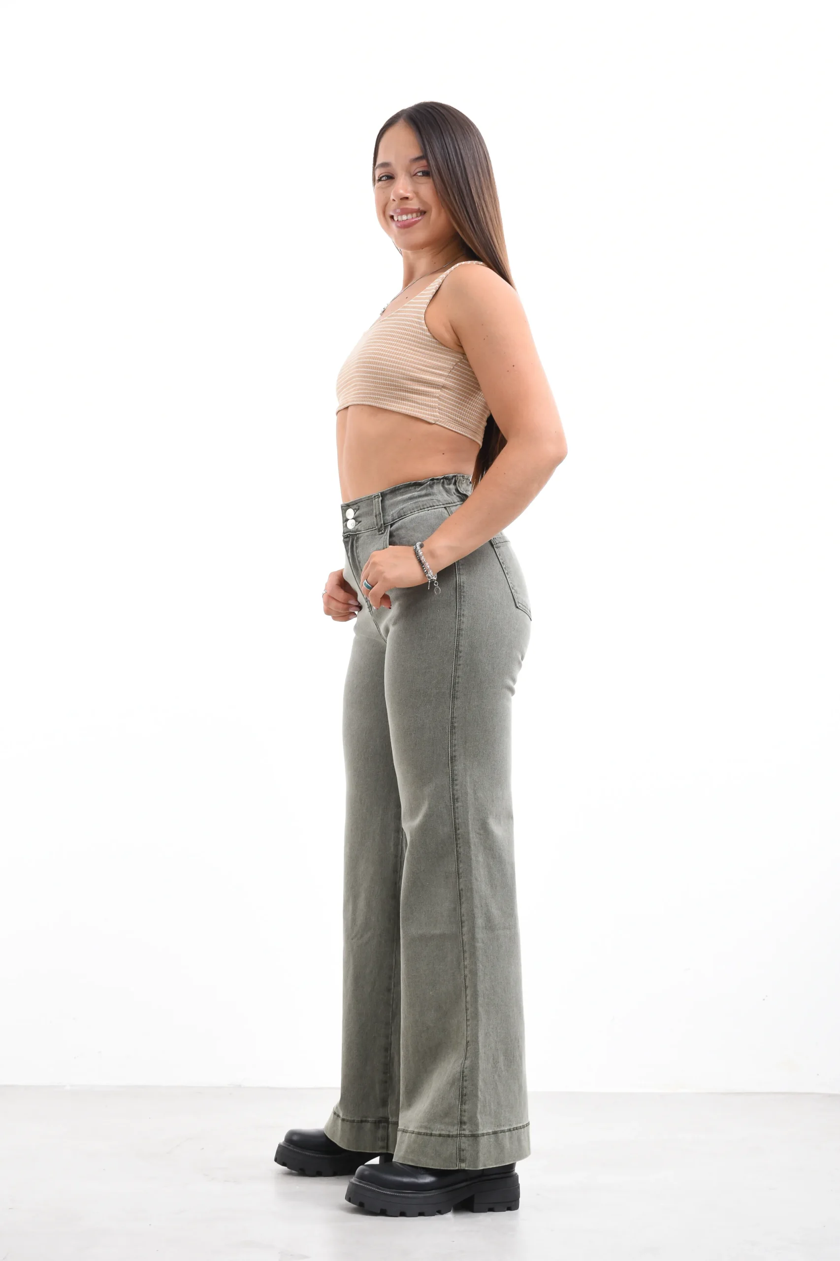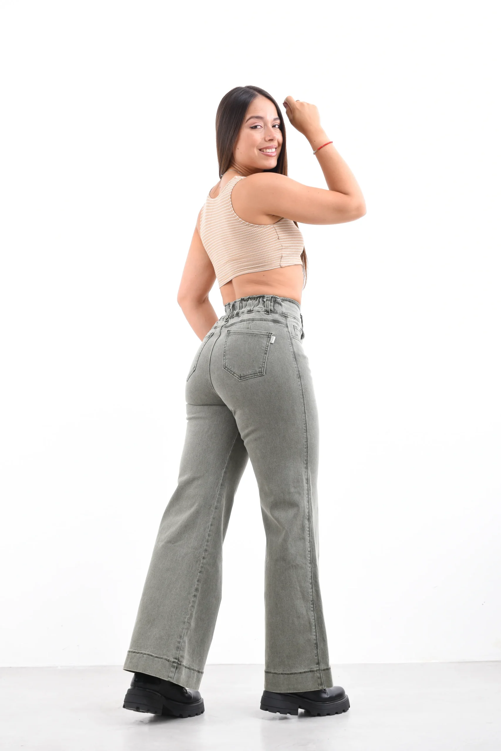 Jean Wide Leg en tono verde, este modelo de tiro alto cuenta con un cierre frontal de doble botón y una innovadora cintura trasera elastizada que se adapta perfectamente a tu figura.