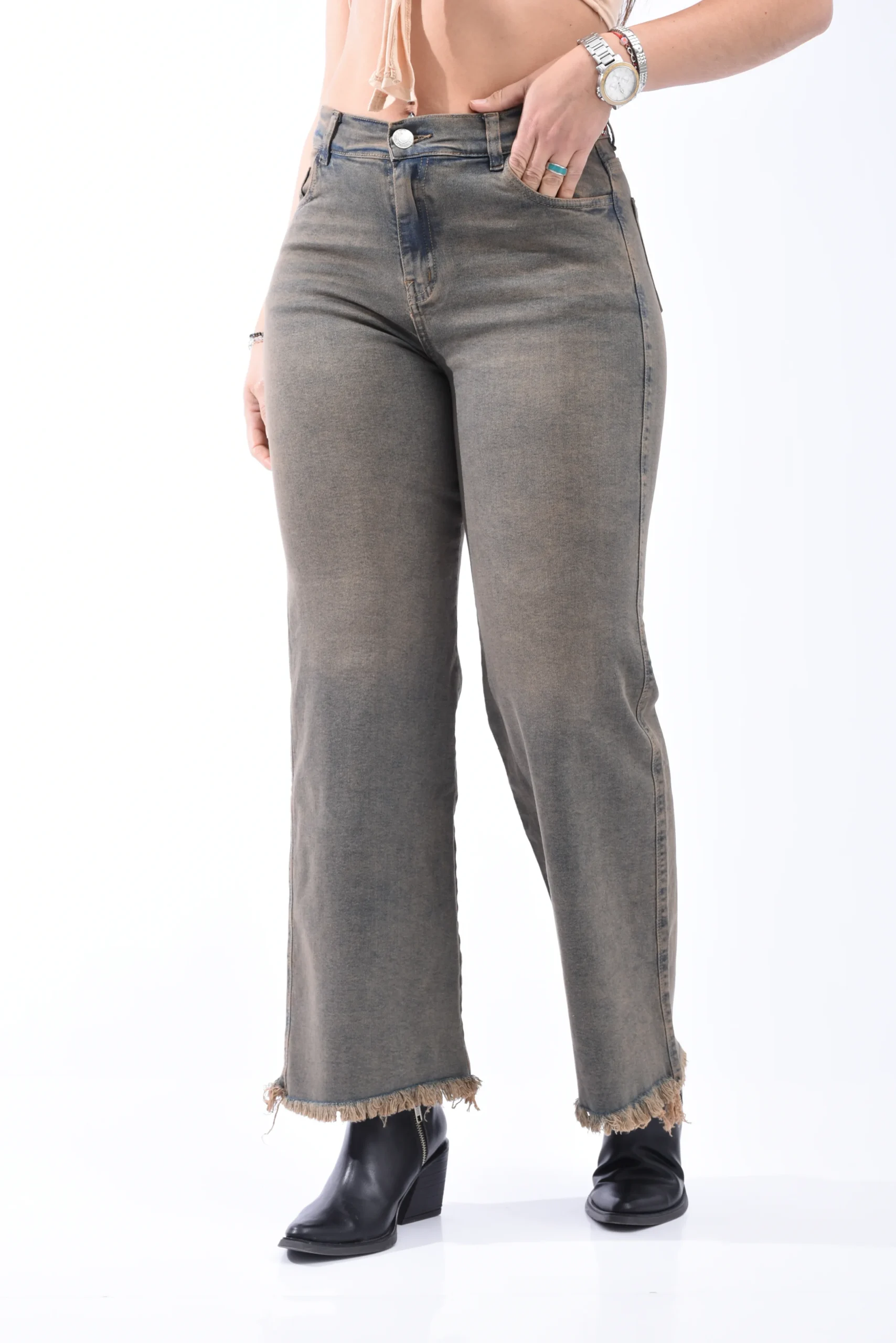 Jean Wide Leg en tono verde, este modelo de tiro alto cuenta con un cierre frontal de doble botón y una innovadora cintura trasera elastizada que se adapta perfectamente a tu figura.