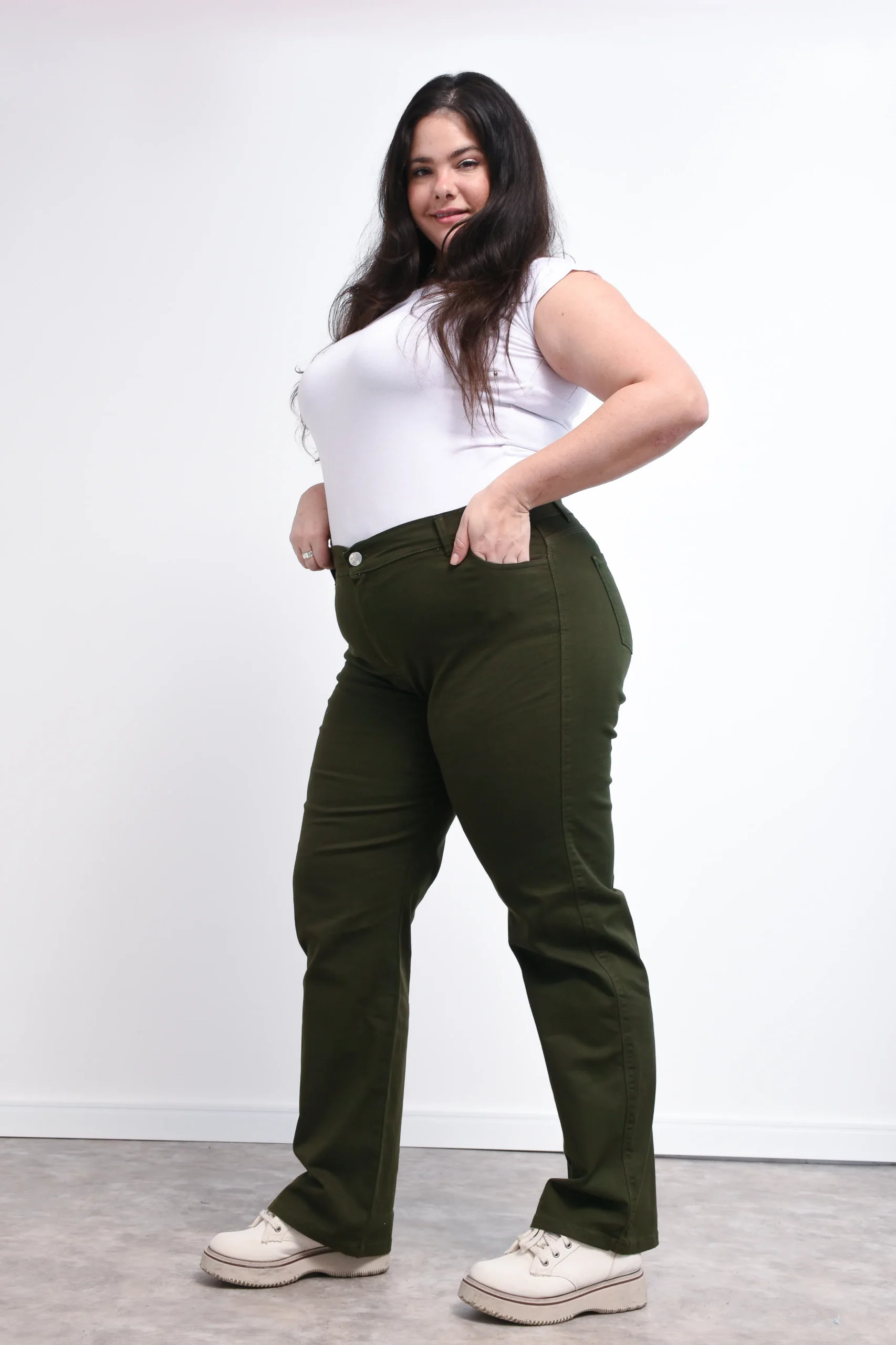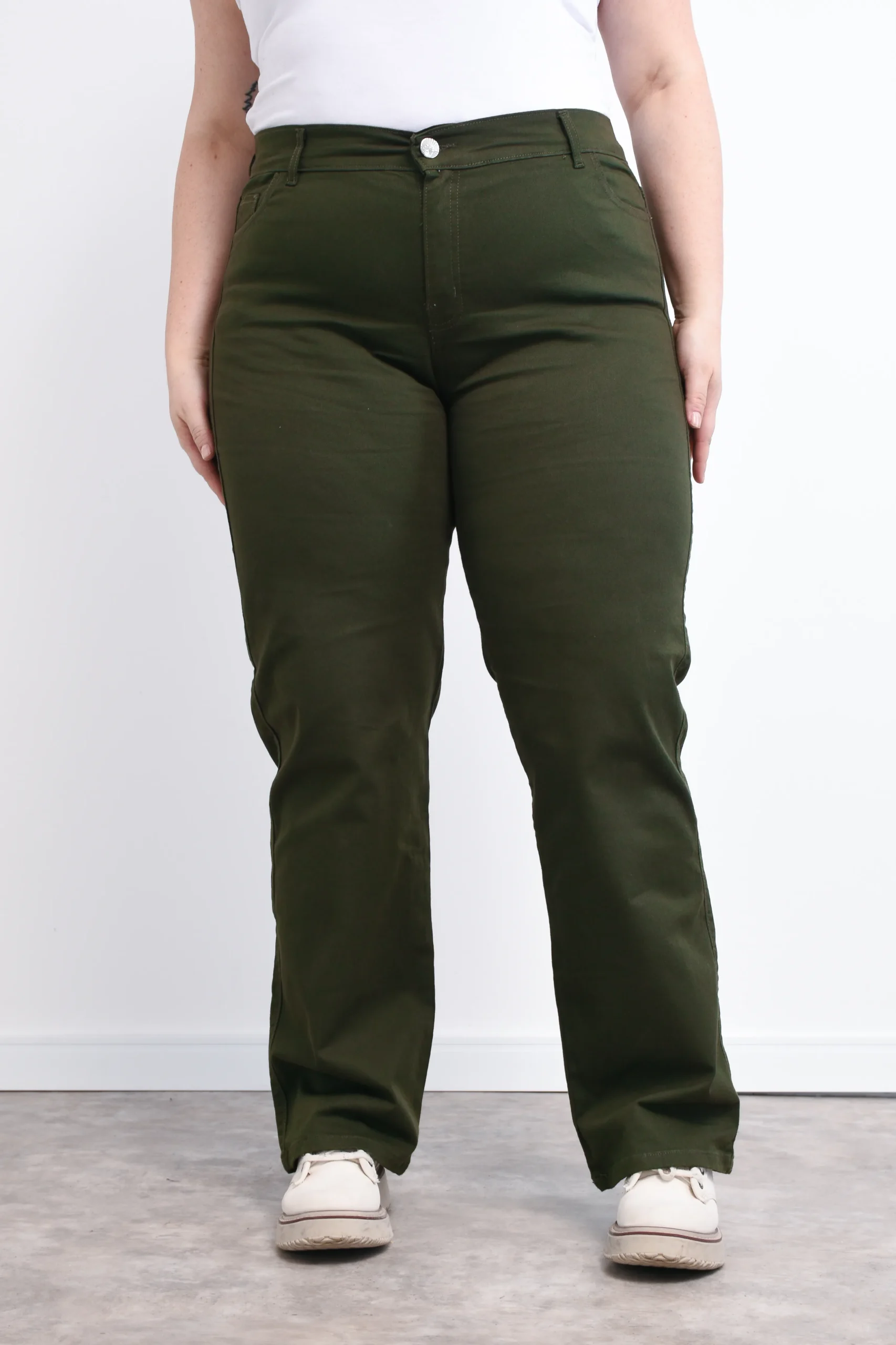 Jean recto elastizado, tiro alto color verde.