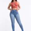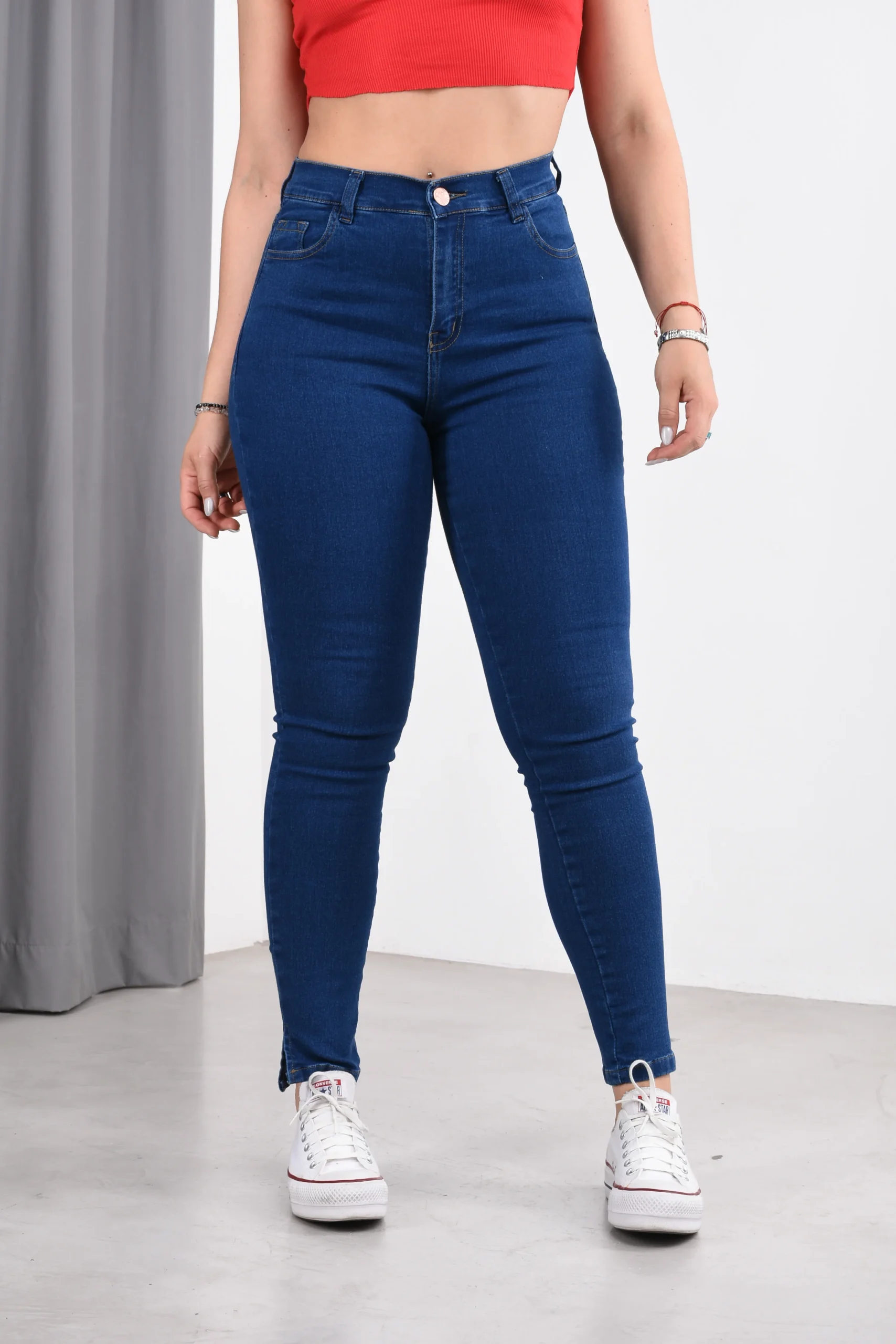 Jean clásico azul, pantalón con tajo en el bota pie, tiro alto elastizado.